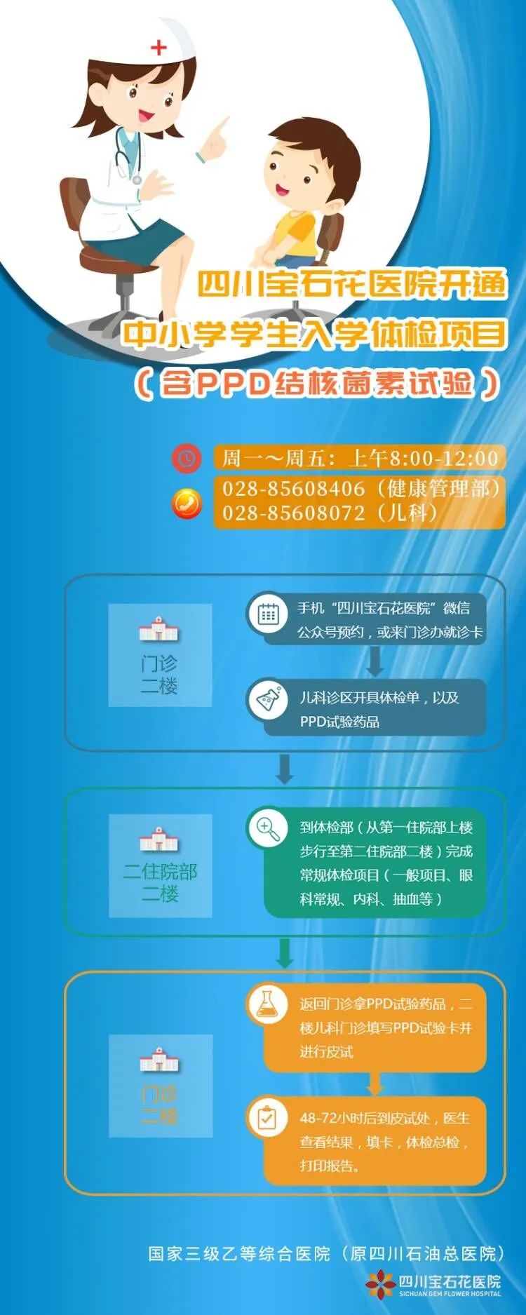 金秋开学在即,很多学校都在要求家长提供一份学生的体检报告,其中包含结核菌素试验(PPD试验),有不少家长在问“结核菌素试验是做什么的,在哪里可以做“,让四川宝石花医院的儿科医师回答您:结核菌素试验就是检查是否感染结核杆菌的皮内试验,在四川宝石花医院儿科门诊就可以做。具体如下: