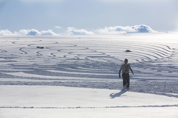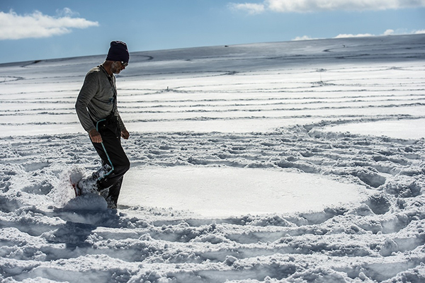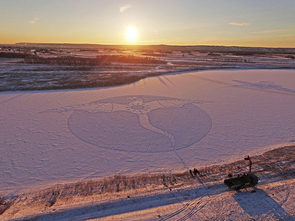 年过五旬的他每天穿着厚重的雪鞋工作5 - 9小时,每幅作品约需9-12个小时,走出的距离大约2万至3万米,一幅画的面积通常是三个足球场大小。如果在朋友圈晒步数的话,应该稳居榜首吧。