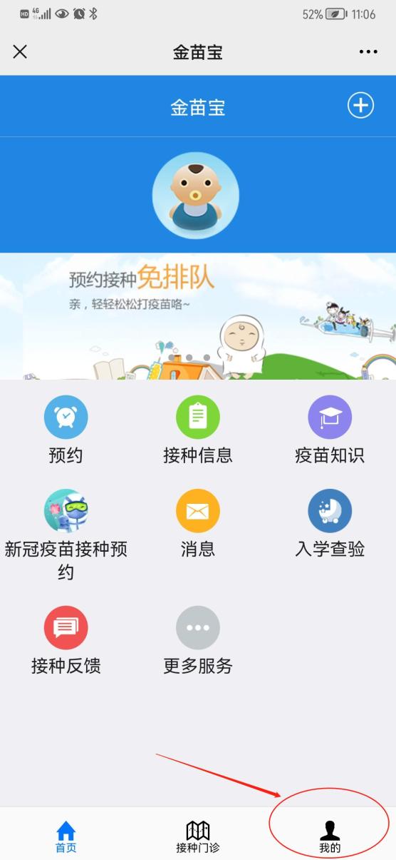 进入对话框,点击下方“预防接种”,出现金苗宝页面,点击右下方“我的”。