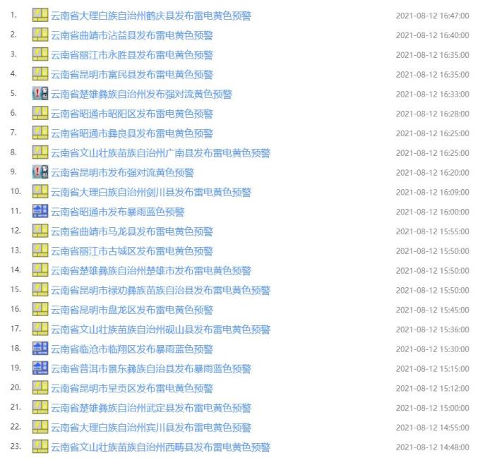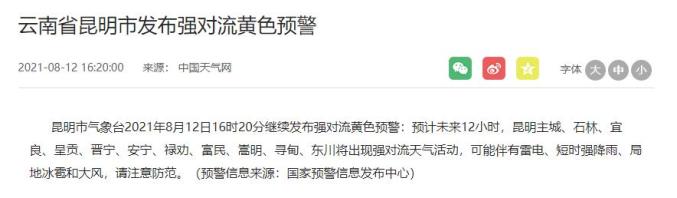 预计未来12小时,昆明主城、石林、宜良、呈贡、晋宁、安宁、禄劝、富民、嵩明、寻甸、东川将出现强对流天气活动,可能伴有雷电、短时强降雨、局地冰雹和大风,请注意防范。