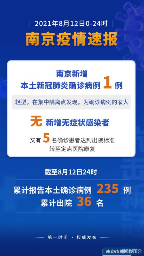 经专家评估,今天南京有5名确诊患者达到出院标准,将转至定点医院康复。截至8月12日24时,南京本轮疫情累计报告本土确诊病例235例,累计出院36例。
