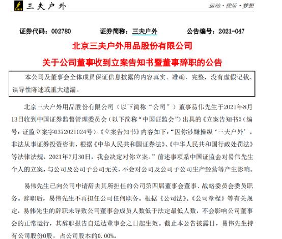 8月13日晚间,三夫户外发布公告称,因涉嫌操纵公司股票,非法从事证券投资咨询,公司董事易伟收到了证监会出具的《立案告知书》,决定对其进行立案调查。