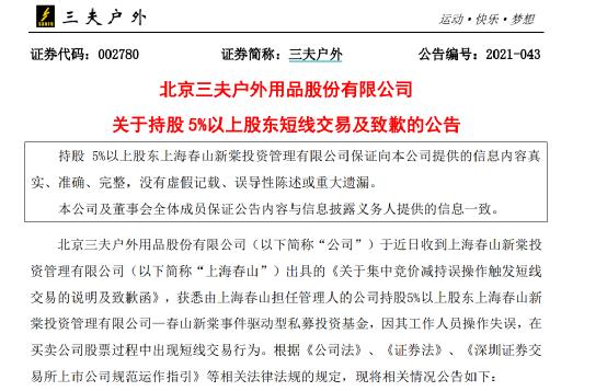 7月21日,三夫户外发布了关于持股5%以上股东短线交易及致歉的公告。公告称,2021年7月15日至7月19日期间,由上海春山新棠投资管理有限公司(以下简称“上海春山”) 担任管理人的公司持股5%以上股东上海春山新棠投资管理有限公司—春山新棠事件驱动型私募投资基金,工作人员在通过二级市场集中竞价方式减持公司股份的过程中,因操作失误,将“卖出”误操作为“买入”,累计买入公司股票2.48万股,交易均价为18.60元。