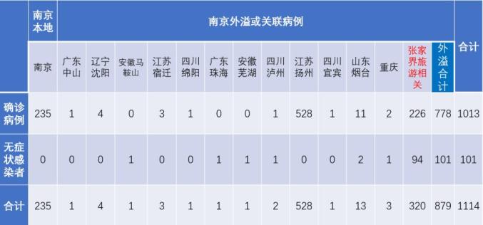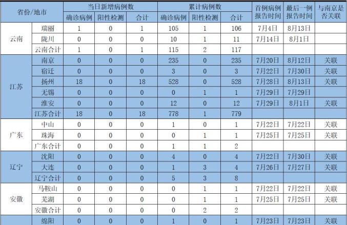 截止8月13日24时,本次南京禄口机场720疫情累计报告确诊病例1013例,无症状感染者101例,其中南京本地报告共报告235+0,外溢及关联病例共报告778+101,各地病例情况具体如下表所示,红色为张家界相关: