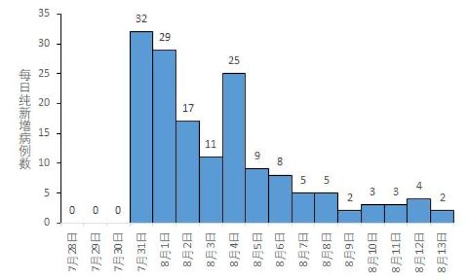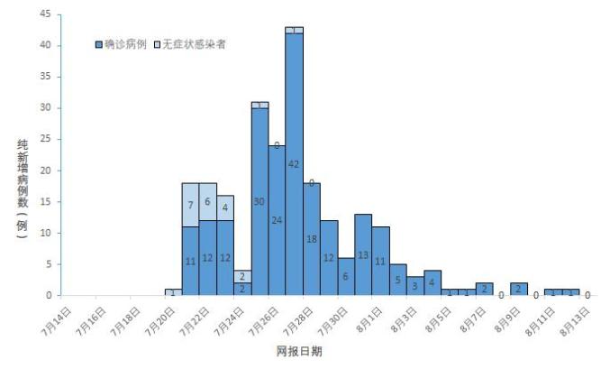南京自7月20日报告本地病例以来,按照网报日期,每日纯新增情况如下图所示。