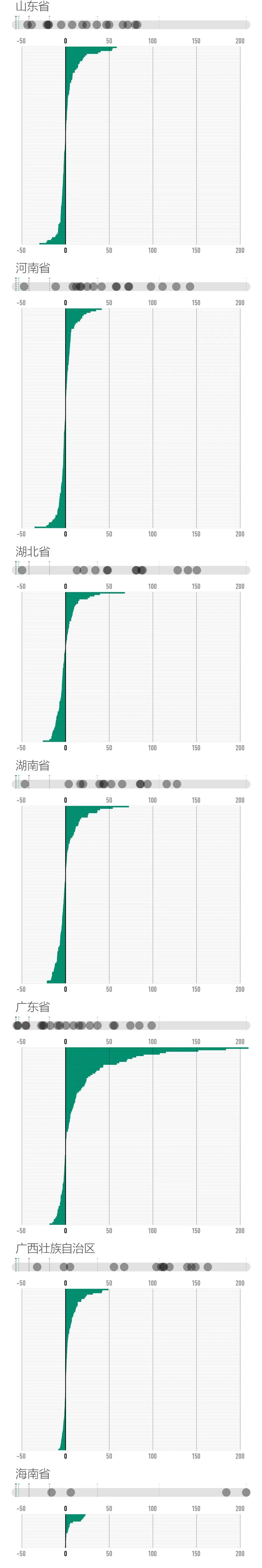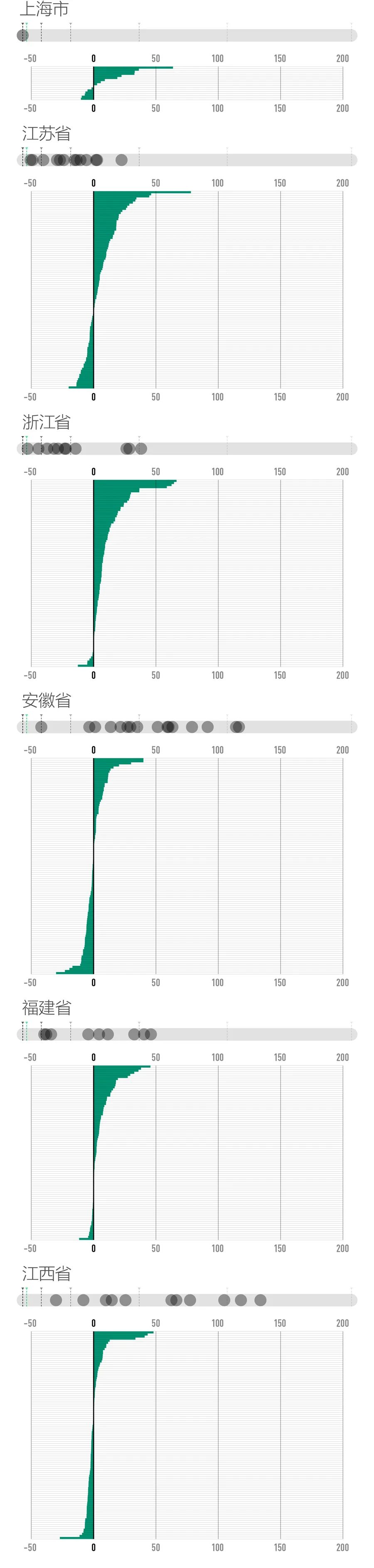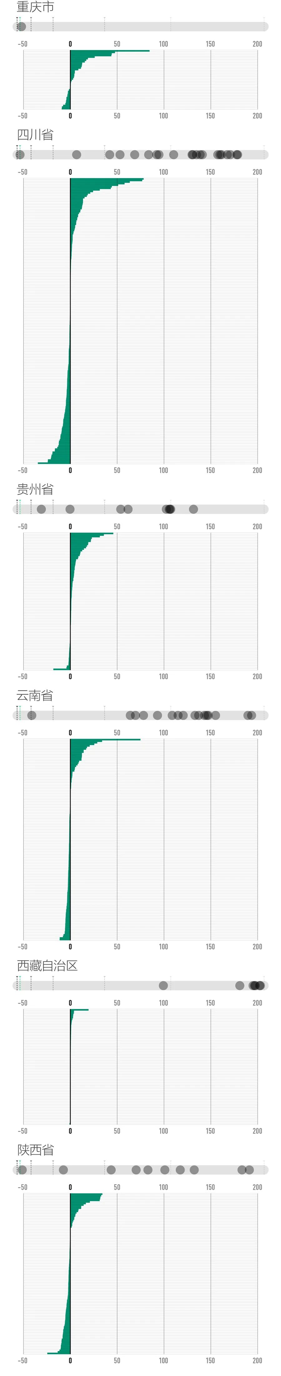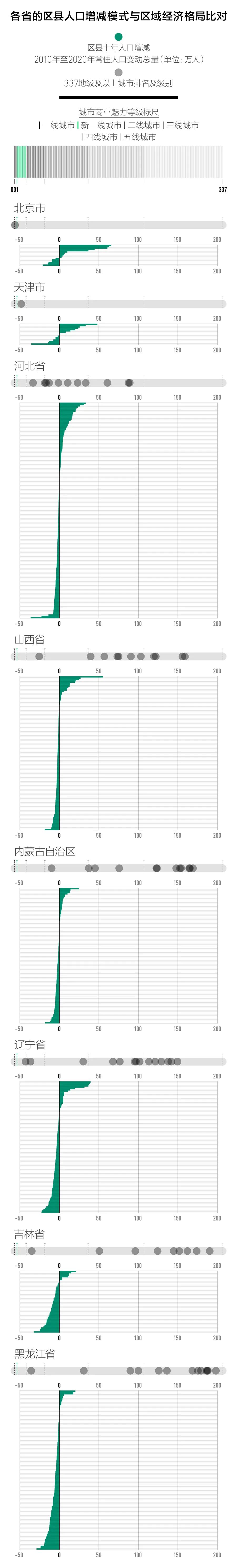 结合上述结论,新一酱顺手总结了每个省份分区县的人口增减模式。在下面的图表中,新一酱按照十年的常住人口变动值由大到小排列了各省的区县,每一根柱子代表一个区县。哪些省份是明显的人口流入地区,哪些省份向外输出人口就更明显了。