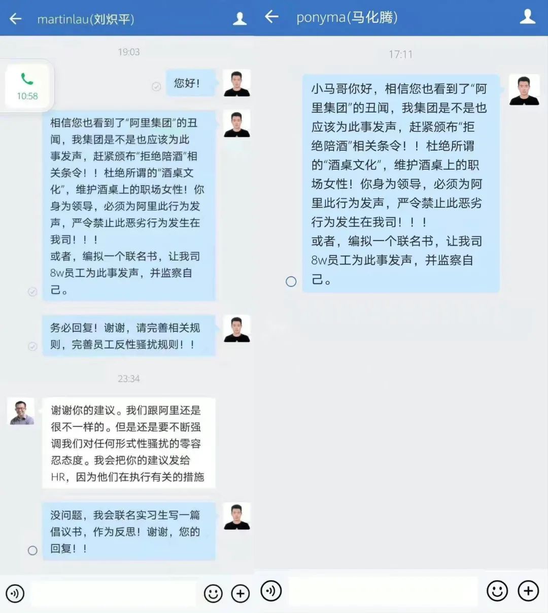 8月10日,网传腾讯一位实习生给CEO马化腾和总裁刘炽平发私信,要求“赶紧颁布拒绝陪酒相关条令”“你身为领导必须为此事发声”“务必回复”,还附上数个感叹号。
