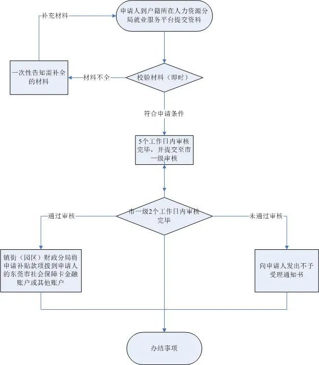 备齐资料→自主选择到各镇街(园区)人力资源服务中心现场提交资料→工作人员受理资料→部门审核→拨到补助对象的东莞市社会保障卡金融账户或其他账户。