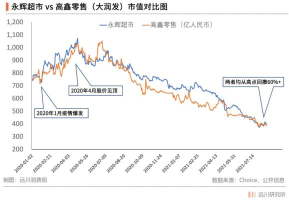 比如曾经遍布大小城市的“大润发”超市,在2019年仍然位列中国超市百强榜第2位,但其母公司——港股上市公司高鑫零售,疫情期间股价短暂接近历史新高后便一路阴跌,市值自高点已缩水62%。
