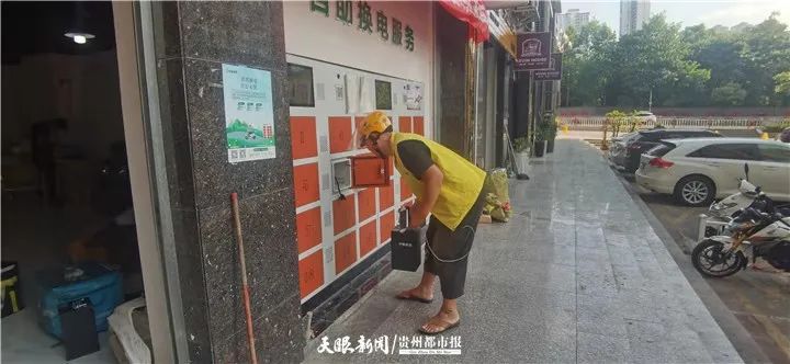 外卖小哥在凯里一商业区的换电柜前更换电池。