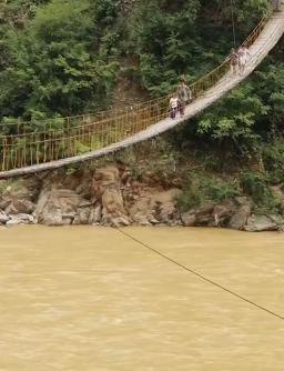 陕西一吊桥桥面倾斜数月 村民冒险通行……