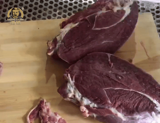冷却定型的牛肉块倒入切片机分割成厚度一致的牛肉片,6毫米的厚度是配料均匀入味、耐嚼却不费事的关键。