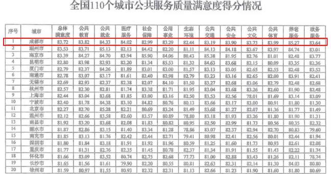 近日,国家市场监督管理总局印发《2020年全国公共服务质量监测情况通报》,监测结果显示,在全国31个省(区、市)共110个监测城市中,成都市以83.72分位居2020年度全国公共服务质量满意度第一位。