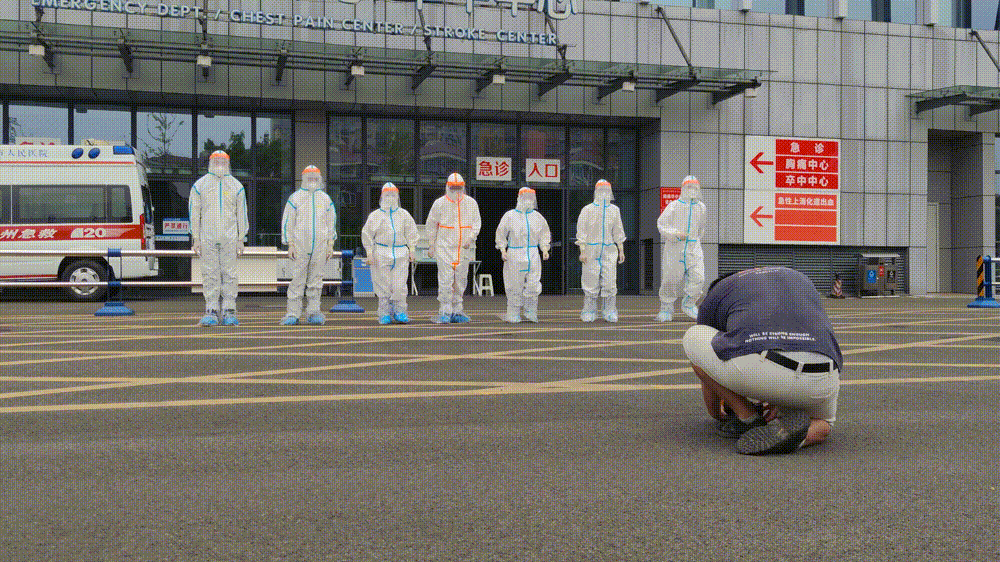 为拍好齐心抗疫的镜头,医生们身着厚重的防护服在闷热天气里来回奔跑。初次体验防护服的主演感叹:“我只穿了半小时就浑身湿透,医护人员真的太难了!”