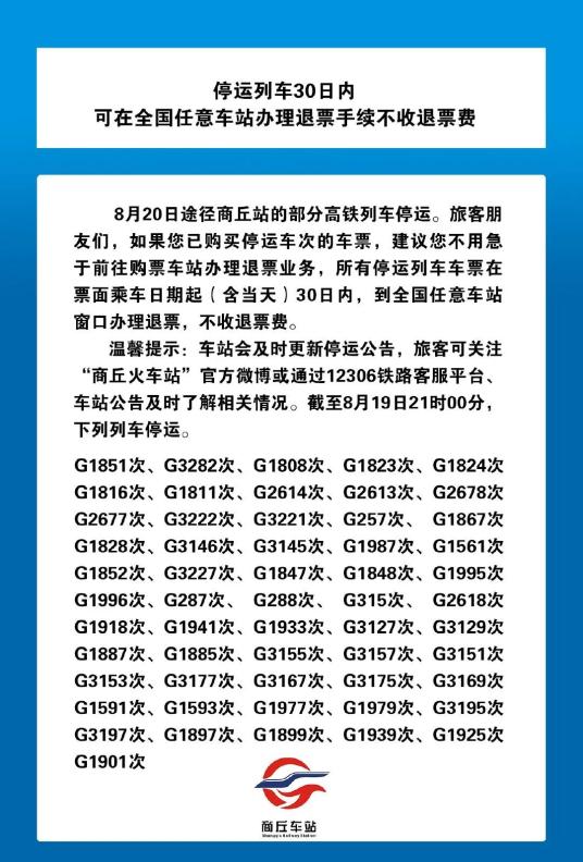 原标题:《8月20日|途经商丘站高铁列车停运信息》