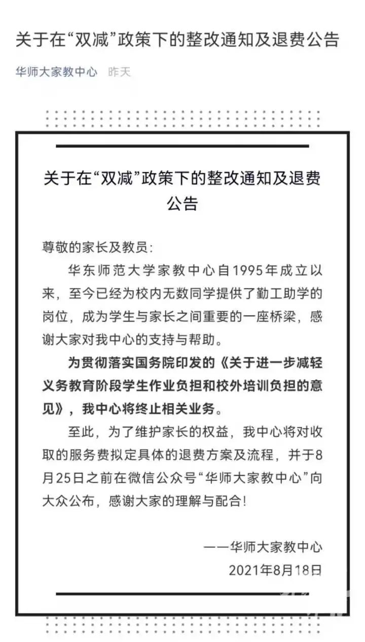 因为“双减”政策 终止相关业务认证信息为华师(上海)教育投资有限公司的华师大家教中心微信公众号,发布了公告,宣布终止相关业务,并且准备退费。