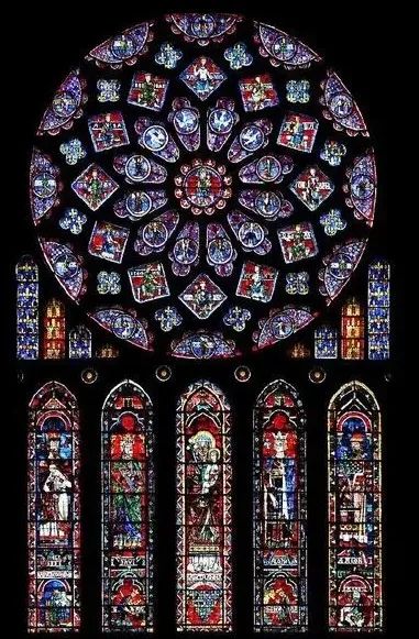 沙特尔大教堂-北面玫瑰窗中世纪诗歌中的色彩也总是明确且不含糊的:草是绿色的,血是红色的,牛奶是雪白色的。每一种色彩都有最贴切的描述对象(比如殷红用于蔷薇);尽管每一种色彩可以有许多种深浅,但不可以逐渐变淡或模糊形成立体感。中世纪的袖珍画证实了中世纪人对基础色以及色彩组合所带来的活力的喜爱。我们不仅在佛兰德斯画家和勃艮第画家的成熟作品中看到这一点,比如《贝里公爵的豪华时祷书》,也在更早的作品中对此有所察觉,比如在11世纪赖兴瑙岛的袖珍画中, “笼罩万物的金色光辉点亮了画面,丁香紫、海洋绿、沙砾黄、粉红色和蓝白色(赖兴瑙岛袖珍画的典型色彩)等冷峻明亮的色彩似乎闪罐着各自的光辉”。“克雷蒂安•德•特鲁亚的文学文本《埃莱克和埃尼德》证明,诗人和画家的生动视觉想象之间有着共通之处: