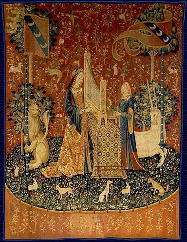 《贵妇人与独角兽》中世纪的色彩理论是其美学的一大源头,要全面理解这一点,就有必要了解当时的流行品位。大众对于色彩的普遍喜爱是深入且根本的,如果我们忽略这一点,就难免会觉得“色彩鲜艳的东西是美丽的”这类说法过于幼稚肤浅。实际上正相反,在色彩领域,当时的哲学家反而被那个时代的感性所影响。圣维克多的修伊正是因此才说绿色是所有色彩中最美丽的颜色,它是春天的象征,是重生的形象。确实,这里面有神秘主义的成分,但他并没有否定感官愉悦的成分。奥弗涅的威廉提出相同的观点,不过他的论证角度基于心理学:他说绿色处于使瞳孔扩张的白色和使瞳孔收缩的黑色的正中间。