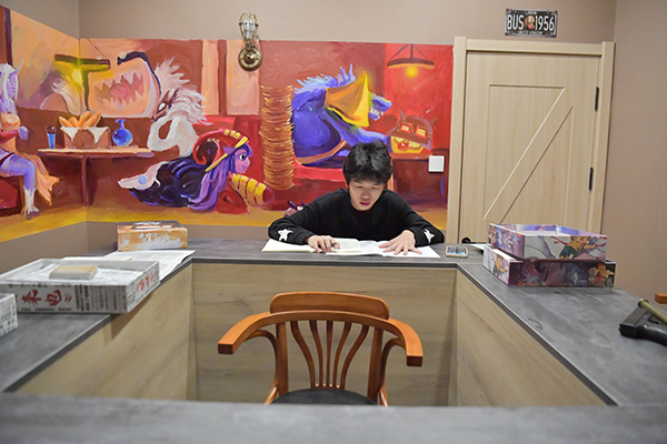 2021年8月3日,在吉林长春一处“剧本杀”门店内,剧本NPC(非玩家角色)吕鹏在阅读剧情。人民视觉 资料图