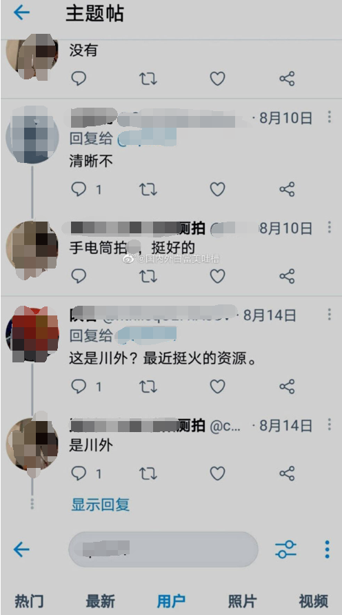 极目新闻记者注意到,网友称“多所高校女厕偷拍视频,在外网推特上散播盈利……”“有人在推上发现有人偷拍川外女厕所,把偷拍照片当做‘资源贩卖’,还不止一个账号”。