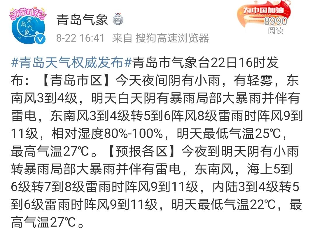 原标题:《暴雨!局部大暴雨!刚刚,青岛发布黄色预警,雷雨时阵风9~11级!》