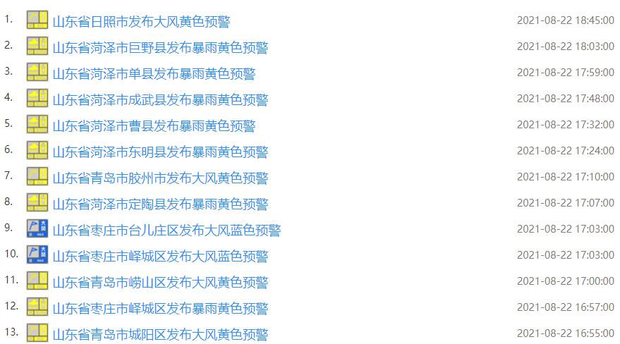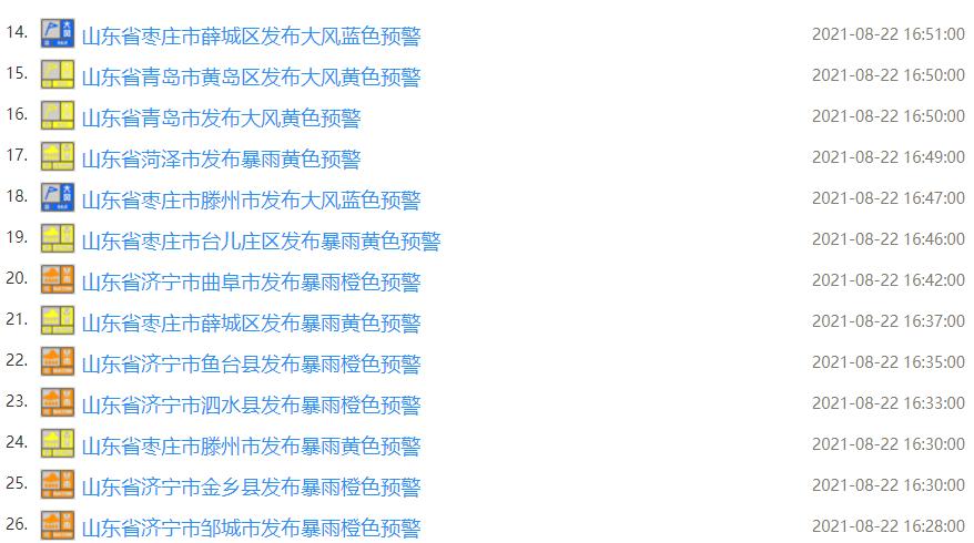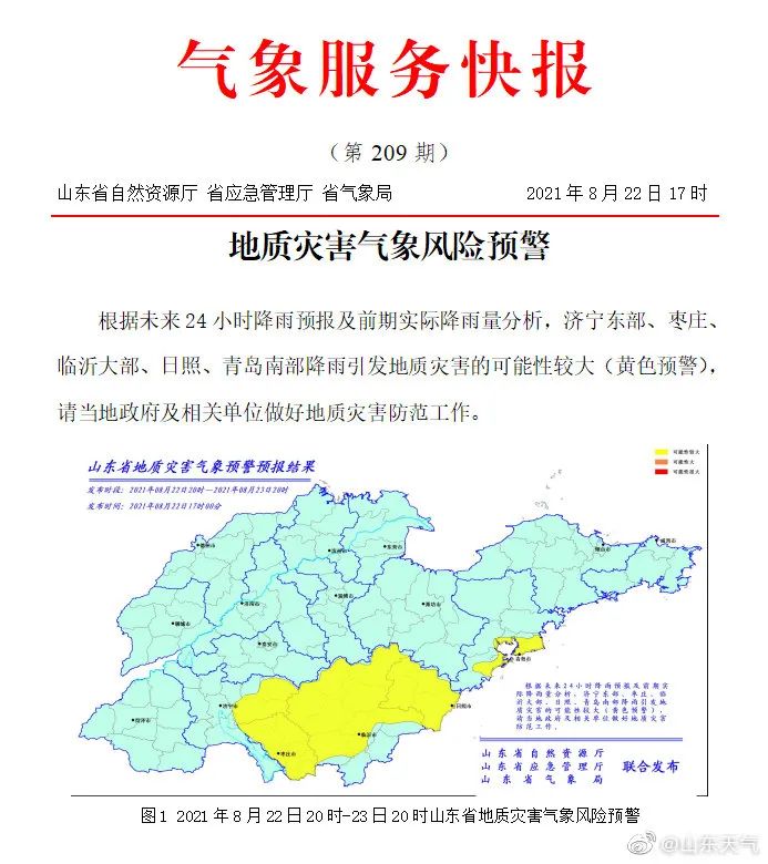 预计8月22日20时至8月23日20时,济宁、枣庄等市局部地区发生山洪灾害的可能性大(橙色预警),临沂、日照、济宁、枣庄等市局部地区发生山洪灾害的可能性较大(黄色预警),临沂、泰安、济宁、日照、枣庄、淄博、烟台、潍坊等市局部地区可能发生山洪灾害(蓝色预警)。