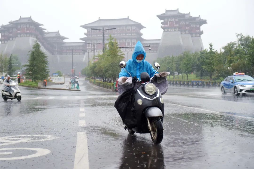 8月22日,河南洛阳,市民雨中出行。图片来源:视觉中国新郑: