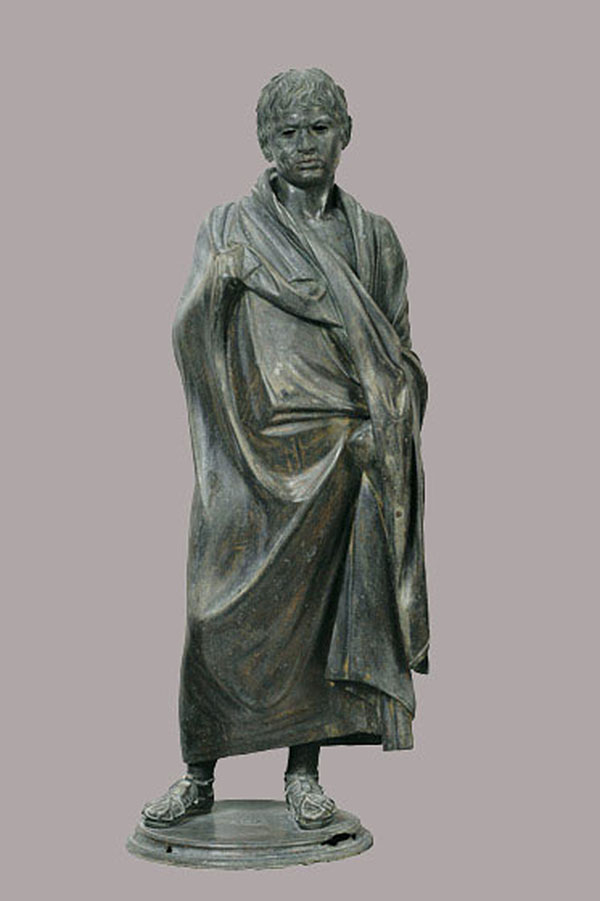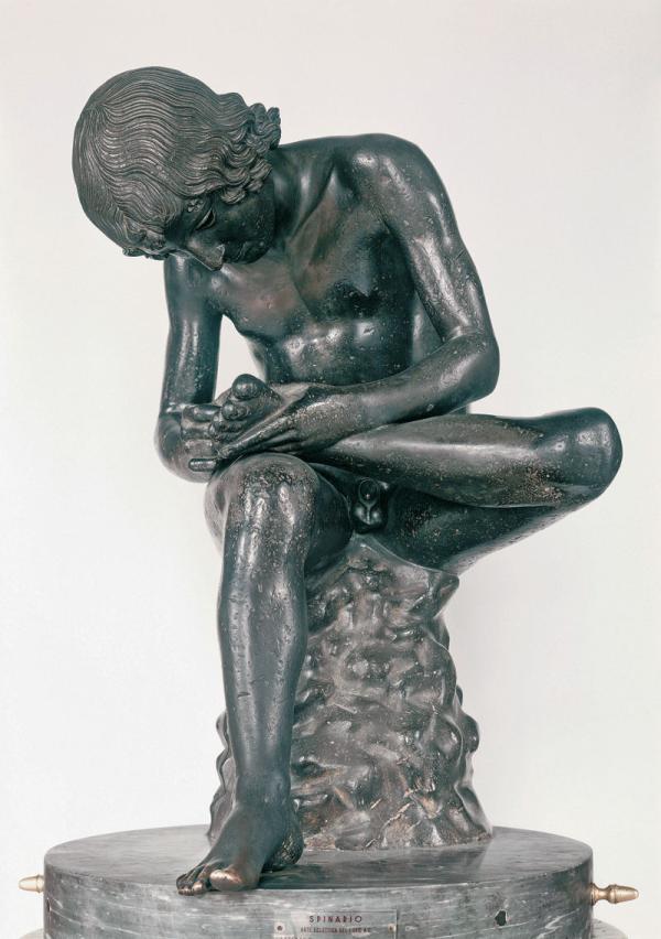 “拔刺的男孩”,又称斯宾纳里,公元前50年所作,可能是那一时期最有名的青铜作品,也被认为是古罗马的象征。这件雕塑栩栩如生地刻画了一位男孩坐在石头上,仔细检查他脚底有没有刺。几百年来,它被人反复复制,其中美第奇家族收藏的那座大理石复制品尤其著名。这件作品也曾启发了文艺复兴时代的大师如米开朗琪罗和马萨其奥。