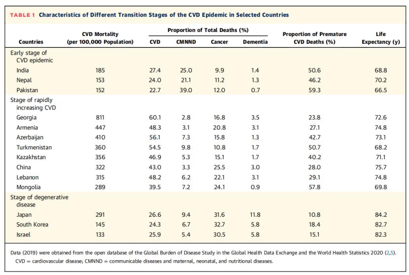 这篇综述不仅比较了疾病谱的特征(即相关疾病类别在总死亡人数中的分布),而且还比较了亚洲国家的心血管疾病死亡率、早发心血管疾病死亡占心血管疾病总死亡人数的比例以及预期寿命。表1总结了心血管疾病流行的不同过渡阶段的特征。