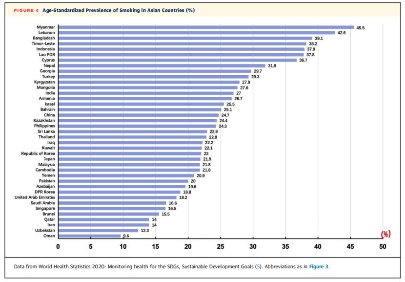 由亚洲国家年龄标准化吸烟率统计(图3)可见,在本报告提供数据的39个亚洲国家中,吸烟率超过30%的国家有8个,超过20%的国家有29个。