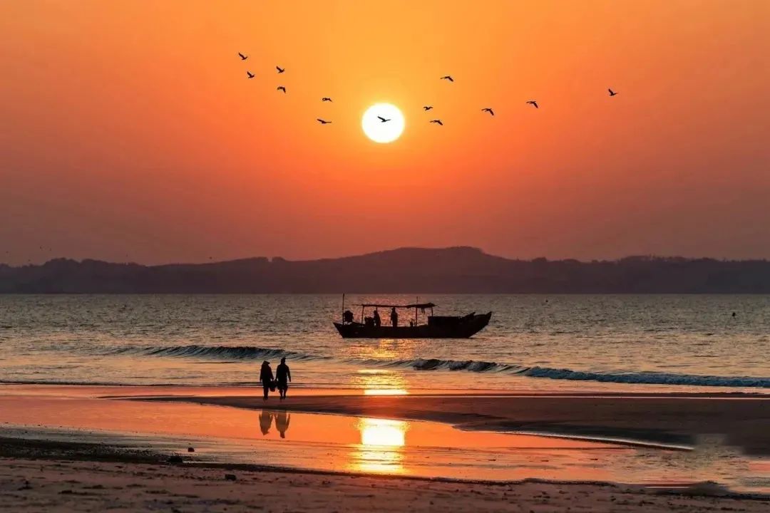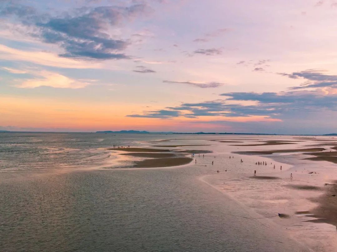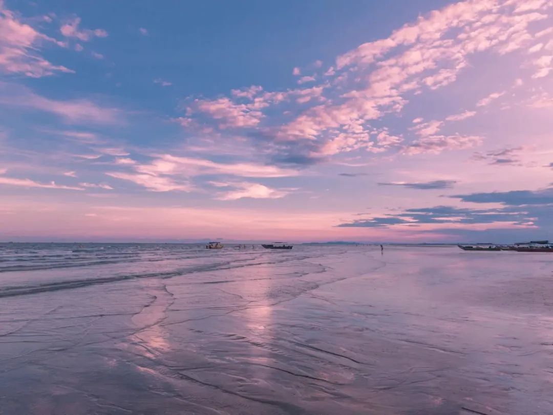 傍晚时分,绵延数10公里万尾金滩,在阳光的柔抚下顷刻间变得万种风情。漫步海滩,一种前所未有的温柔迎面而来,粼粼的海面与粉色的天空杂糅在一起,恍若来到了仙境。