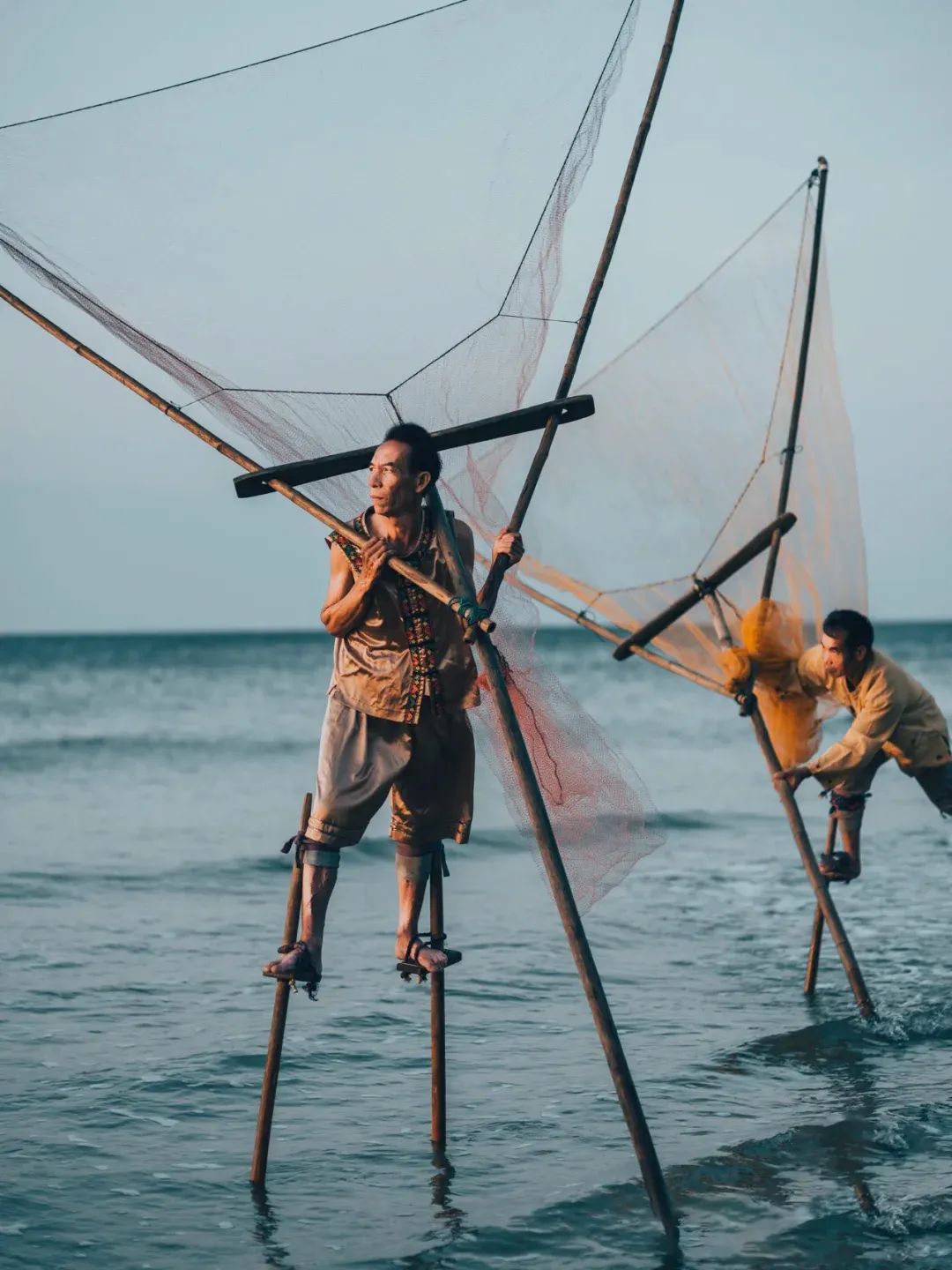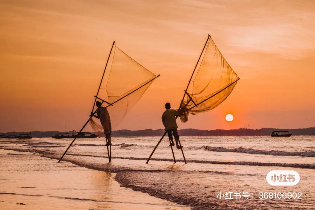 海风缱绻,光影轻柔。赶海的渔民脚踩高跷、游刃有余地进行捕捞。飘扬的渔网与淳朴的背影和一望无际的大海交融映衬,真·难得一见的风光大片。