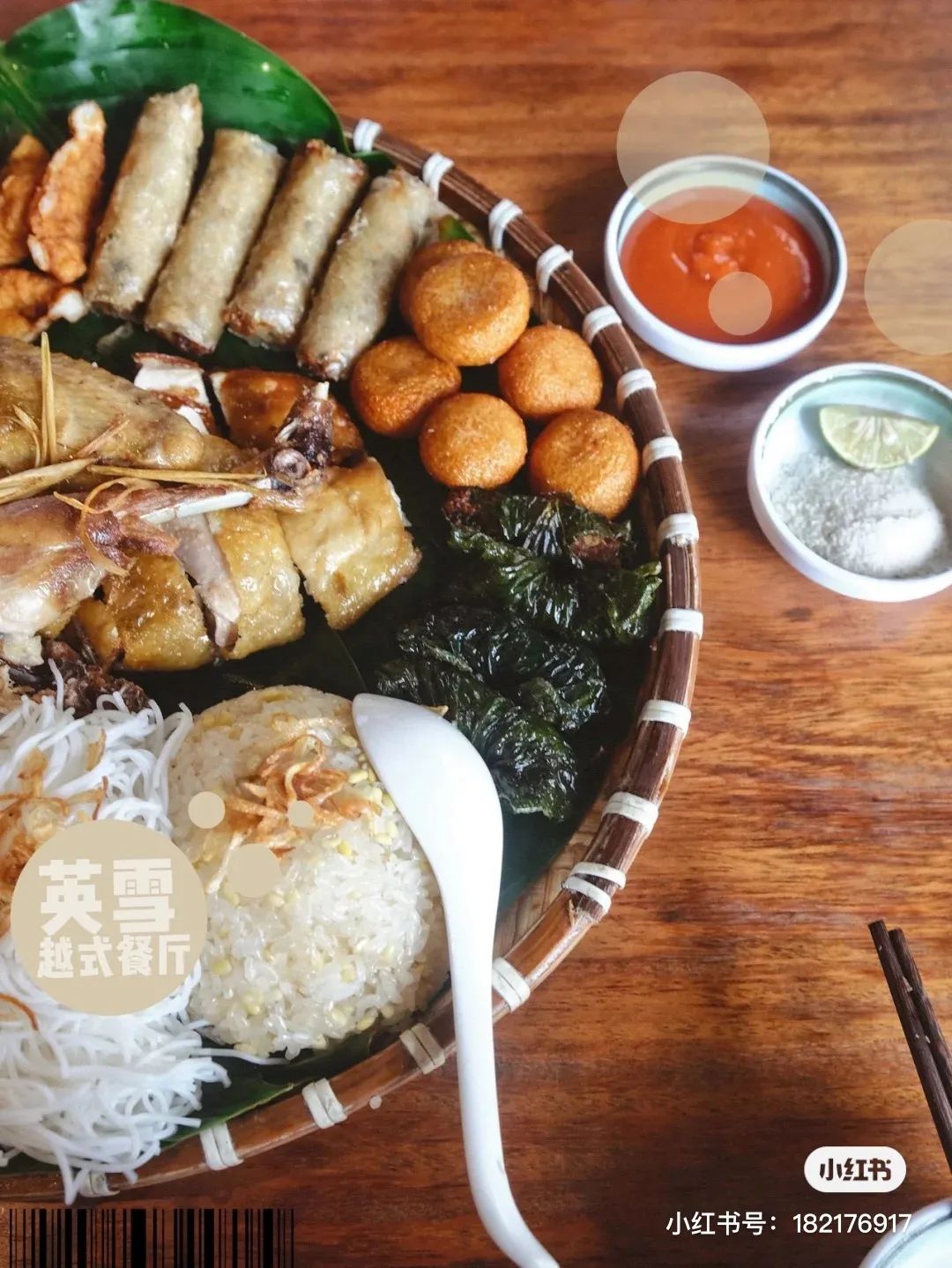 如果同行的朋友多的话,可以点一份越式大拼盘。爽口的蟹籽丸、可口的糯米饭、香脆的春卷与烤鸡包肉混搭在一起,味道真绝绝子!