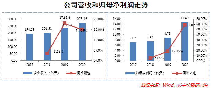 资产重组后,公司业务稳步发展,业绩表现亦是可圈可点。2017~2020年,公司营业收入由194.59亿元增至273.16亿元,年均增速为12%;归母净利润由7.07亿元增至14.8亿元,年均增速为27.9%,其中2020年同比更是达到了68.56%;研发支出则是由1.62亿元增至2.88亿元。此外,2017年以来公司毛利率整体上呈稳中有升之势,费用率则持续下降,反映出盈利能力的日益改善。