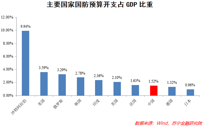 众所周知,强大的国防军工实力是一切经济社会发展的前提,是国家安全战略、地缘战略和军事战略的基本保障,也是所有科技战的最高阵地,更是大国博弈的主战场。放眼全球,近几年国际形势愈发复杂多变,不确定性日益上升,世界上的主要国家都将国防摆在了极其重要的位置。我国国防预算开支虽然以2077亿美元位居世界第二,但仅占全国GDP的1.5%左右,不仅大幅度低于沙特阿拉伯的9.94%,也低于美国、俄罗斯、韩国、印度、英国等国家,仅排在全球第八名——这与我国经济体量、国土面积以及国防需求显然是不匹配的,大力发展国防军工建设刻不容缓。