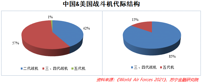 此外,我国军用飞机的代际结构与美国也存在差距。来自《World Air Forces 2021》的数据显示,在我国的战斗机当中,以歼7、歼8为代表的二代机存量占比仍高达42%,而美国空军二代机已经基本退役,目前已形成了以F-15、F-16等四代机为主,F-22、F-35等五代机为辅的格局,四代机和五代机占比分别为85%和15%。