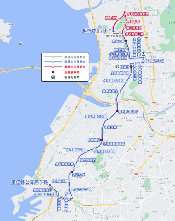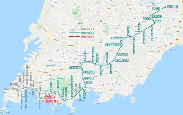 取消站点:铁路青岛站郯城路(仅下行)、广西路浙江路(仅上行)、青岛路(仅上行)。
