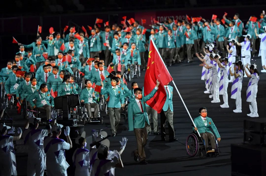 女子射箭运动员周佳敏、男子田径运动员王浩执旗,率中国体育代表团进入东京奥林匹克体育场。