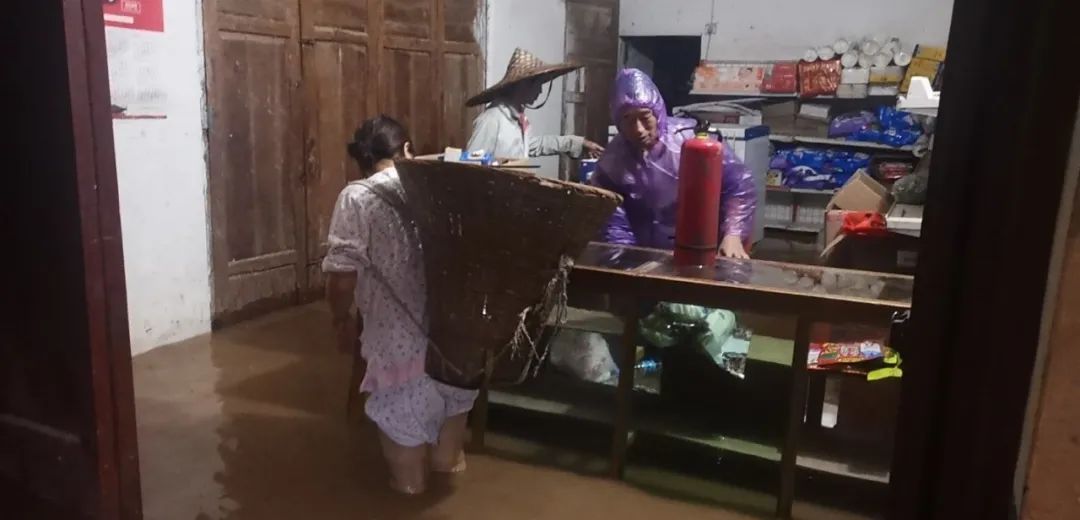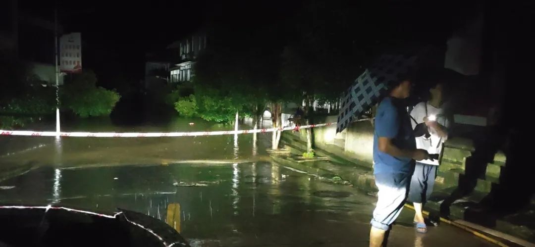 乡镇工作人员星夜巡视沿河地带雨水影响情况。
