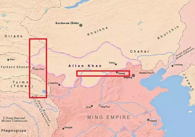 但阿勒坦汗治下的土默特蒙古,却无法回避自己的损失。这个新兴的草原强权,一方面需要保护境内的牧民不受明朝边军的侵害,另一方面也要加强防御西部瓦剌蒙古人的实力。虽然占据着古代世界非常重要的河套与鄂尔多斯山脉,还是无法解决两面受敌的战略困境。因为草原的西部已经被瓦剌控制,而河套地区也被明军的嘉峪关与哈密卫阻挡,没有任何可以寻觅的捷径。唯一的出路就是尽快获准加入明朝的朝贡体系,进口到内地生产的货物。