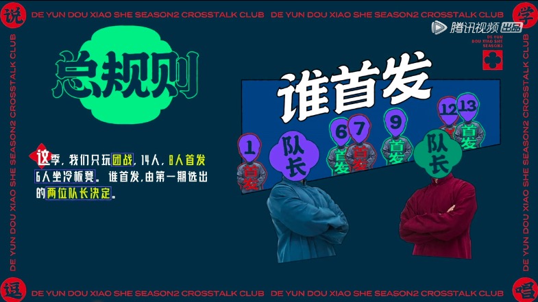 说回节目本身,毕竟是德云社的团综,相声本身还是理所应当地成为了节目的落点。和第一季相同,节目分为真人秀和相声两个部分,第一季中真人秀的输赢定夺的是相声表演的出场顺序,相声表演的名次又决定淘汰顺序,两环相扣。到了第二季,节目形式变为“团体战”,真人秀中的赢家有资格竞选队长,而队长又有挑选队员的权力,被剩下的德云社演员则在本期坐“冷板凳”,无缘上台演出。
