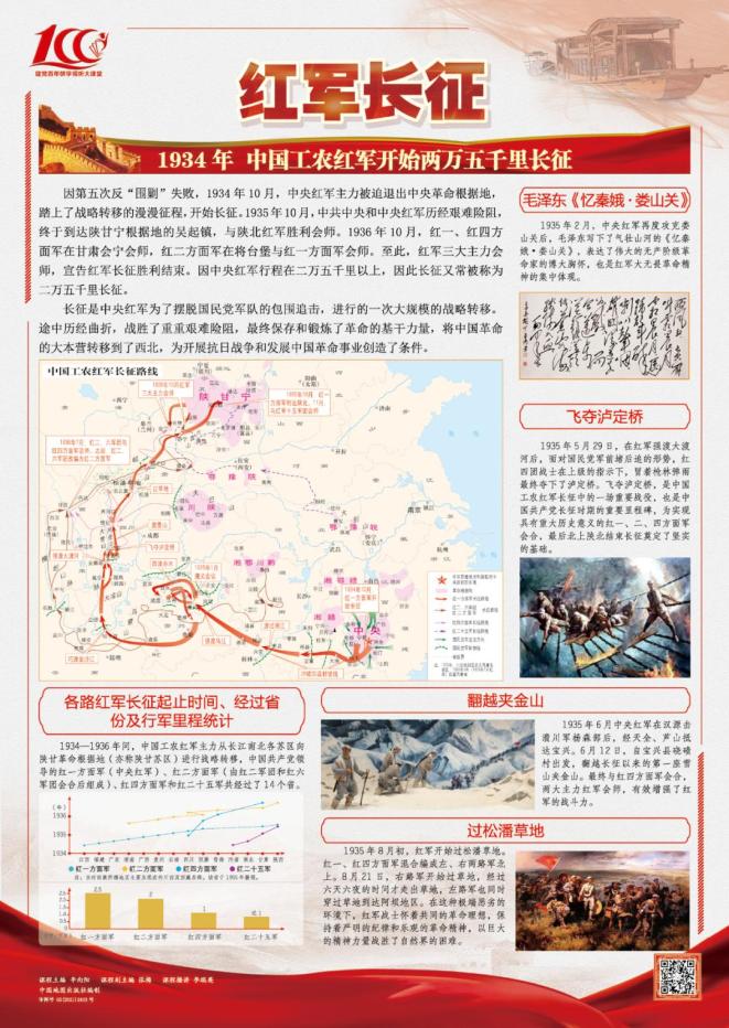 《建党百年研学视听大课堂》挂图以党课为基础,将内容用地图、文字、图表和图片的形式表达,分为25个专题,共25张尺寸为840毫米×594毫米大对开挂图,直观清晰地概括了中国共产党的百年历程,让中小学生通过视觉体验形成党史的整体印记,生发出对党的光辉历程的由衷敬仰。