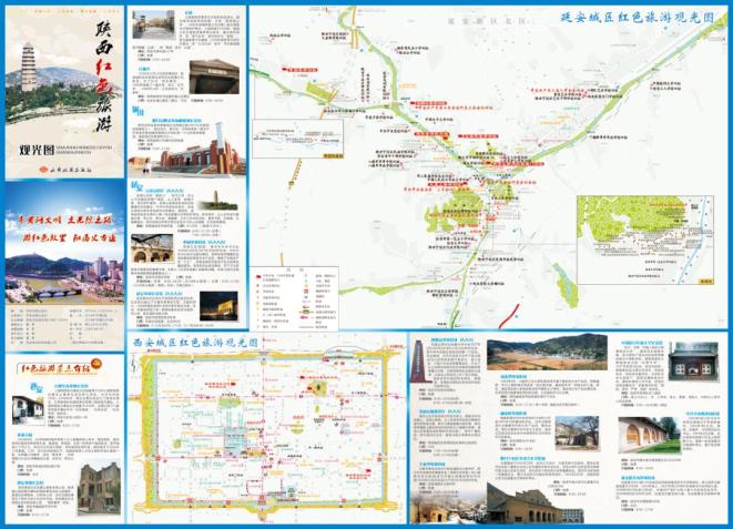 《陕西红色旅游观光图》正面内容为“延安城区红色旅游观光图”“西安城区红色旅游观光图”两幅地图及相关文字介绍,背面内容为“陕西红色旅游观光图”“陕西小吃特产分布”两幅地图及“红色旅游线路推荐”“历史那一刻”等文字信息,内容丰富,设计精美,重点突出了陕西浓厚的历史文化资源和具有红色历史的光荣革命传统。