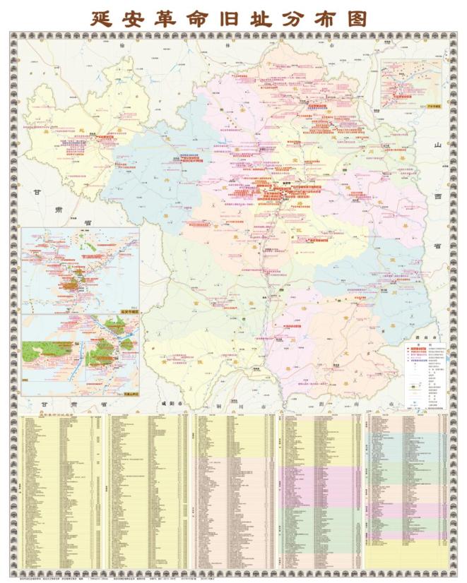 《延安革命旧址分布图》以延安市政区为基础地理要素编制而成的两全开单面地图,用四种不同的符号和颜色标注了延安市内国家级、省级、县区级及未定级革命旧址的详细分布,通过索引方式,使读者能快速准确的查找革命旧址的地理位置及周边情况。