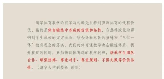 体育类课程要树立健康第一的教育理念,注重爱国主义教育和传统文化教育,培养学生顽强拼搏、奋斗有我的信念,激发学生提升全民族身体素质的责任感。