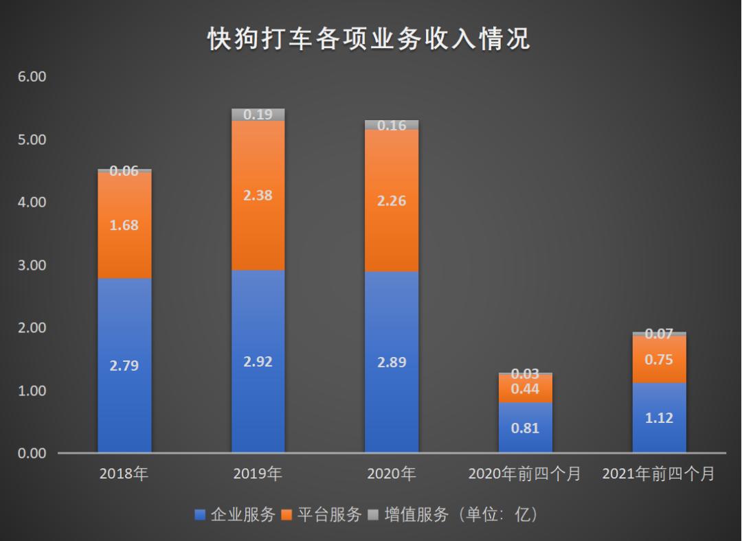 在快狗打车的三项业务中,平台服务和企业服务是核心业务,也扛起了创收重担。另外一个增值服务所占比重较小,主要是向司机推荐一些加油站、车辆维修保养中心、汽车制造商、经销商等信息,为这些客户引流,同时收取佣金。