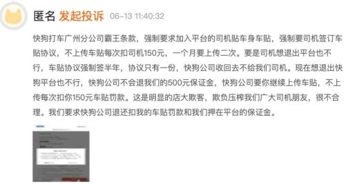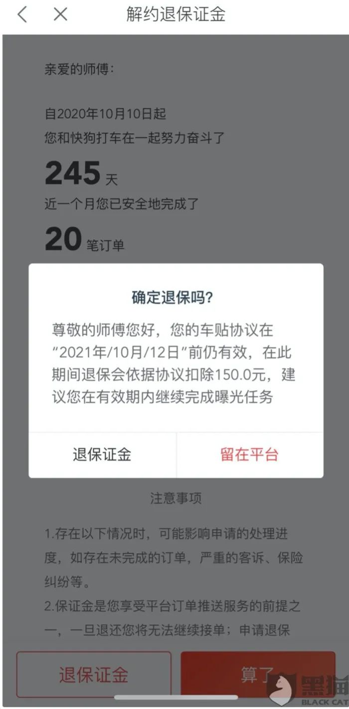 “一个月要上传两次车贴,一次不上传就扣费150元。要是司机想退出平台也不行,车贴协议强制签半年,不仅不退500元保证金,还会要求司机继续上传车贴,并且照常罚款。”一位车主在黑猫投诉讲述自己的经历。