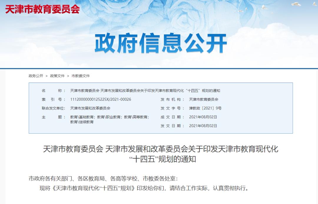 《天津市教育现代化“十四五”规划》近日出炉,其中明确:天津将建成天津医科大学、中国民航大学新校区,建设天津美术学院、天津音乐学院新校区。(详情)