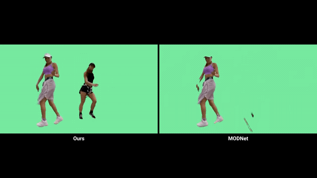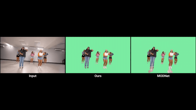 对于多人舞蹈视频而言,RVM的表现也很nice。即便动来动去、头发乱甩,也没有影响它的抠图效果。