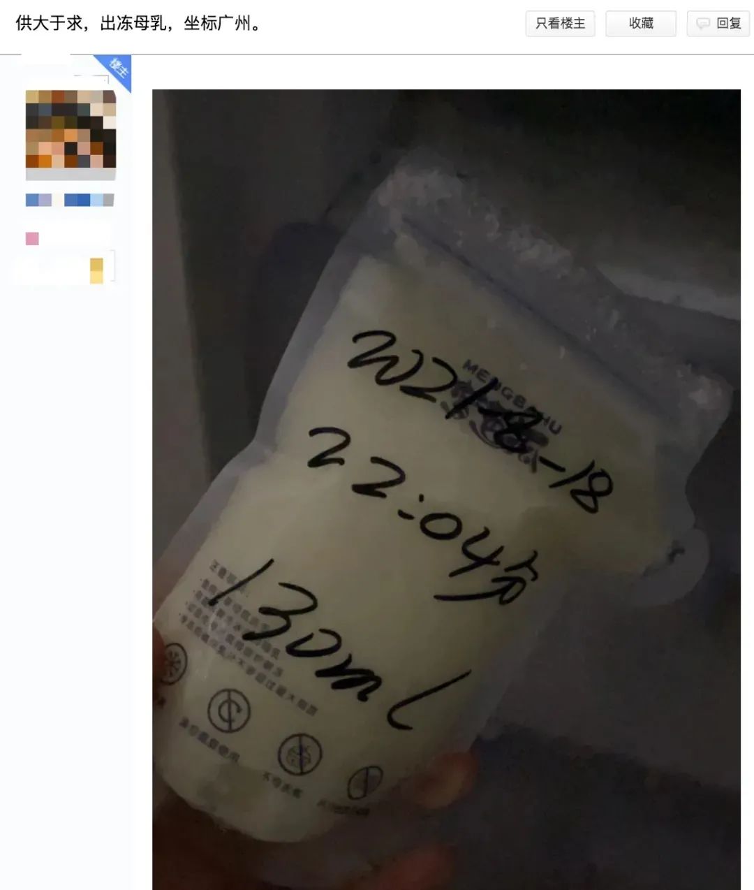 记者以“母乳、冻奶、人乳”等关键词检索后发现,在百度贴吧、知乎、小红书、豆瓣、微博等互联网社交平台上,有大量声称进行人乳交易的网帖。其中,聚集了3.2万名用户的百度“母乳喂养吧”,不时有卖家发帖称“有货”可售,配有疑似人乳的照片,底下不少买家留言咨询、“求货”。
